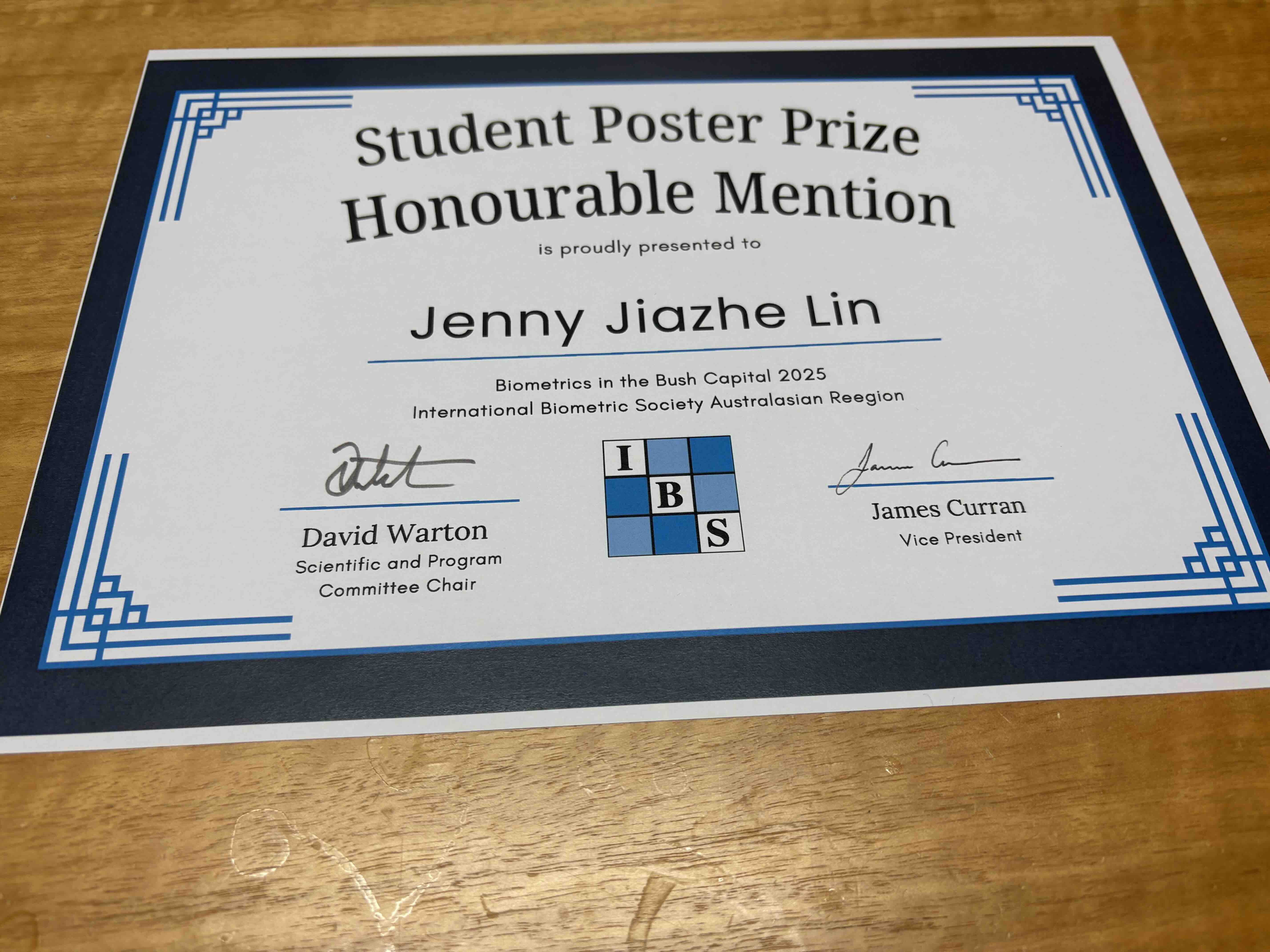 ggincertafor uncertainty visualisation with a layered grammar of graphics, and - Jenny for receiving the Honourable Mention for the Student Poster Prize based on her Honours project on Factor Analytic Mixed Models and Plackett-Luce Models for Multi-Environmental Trials.